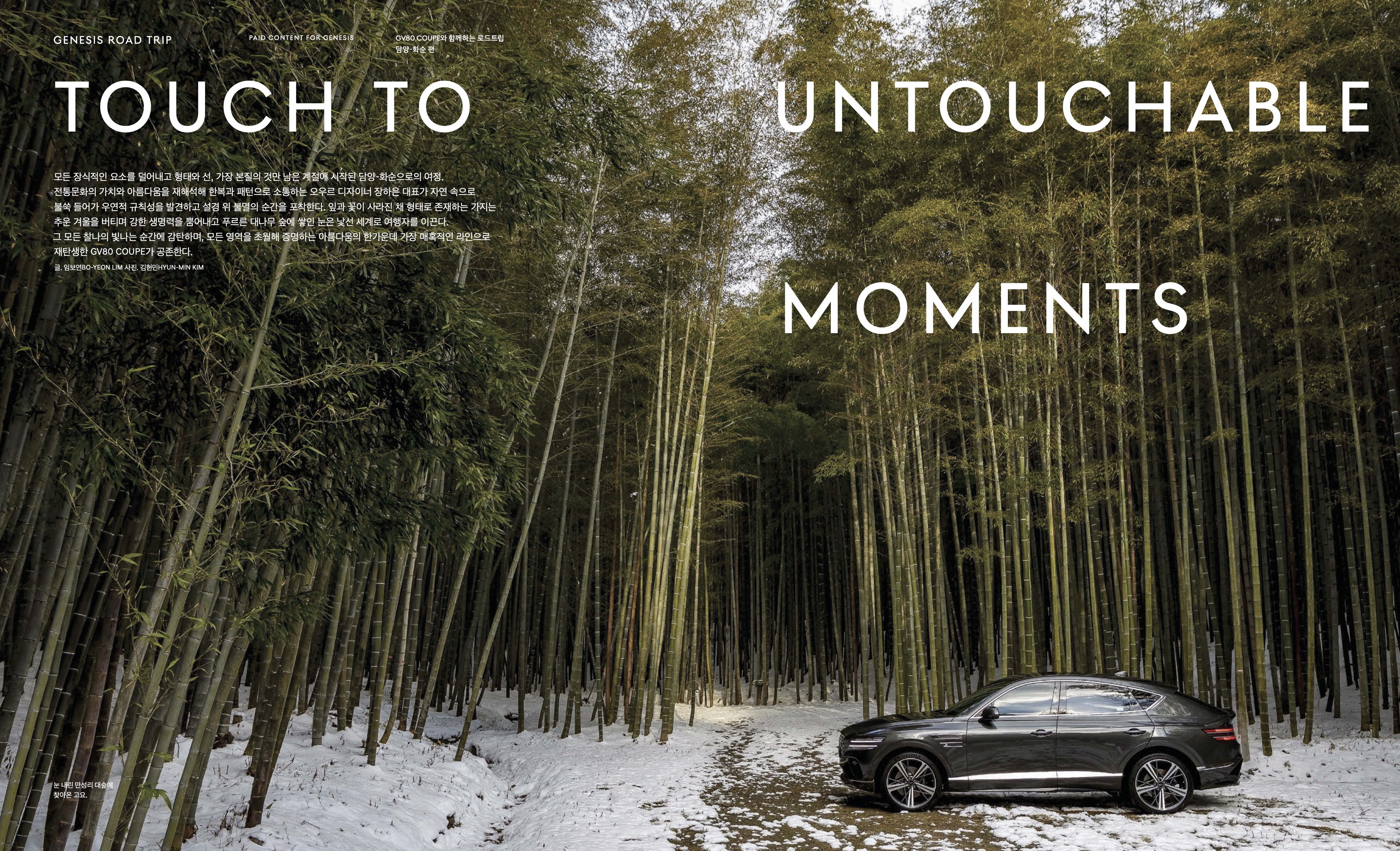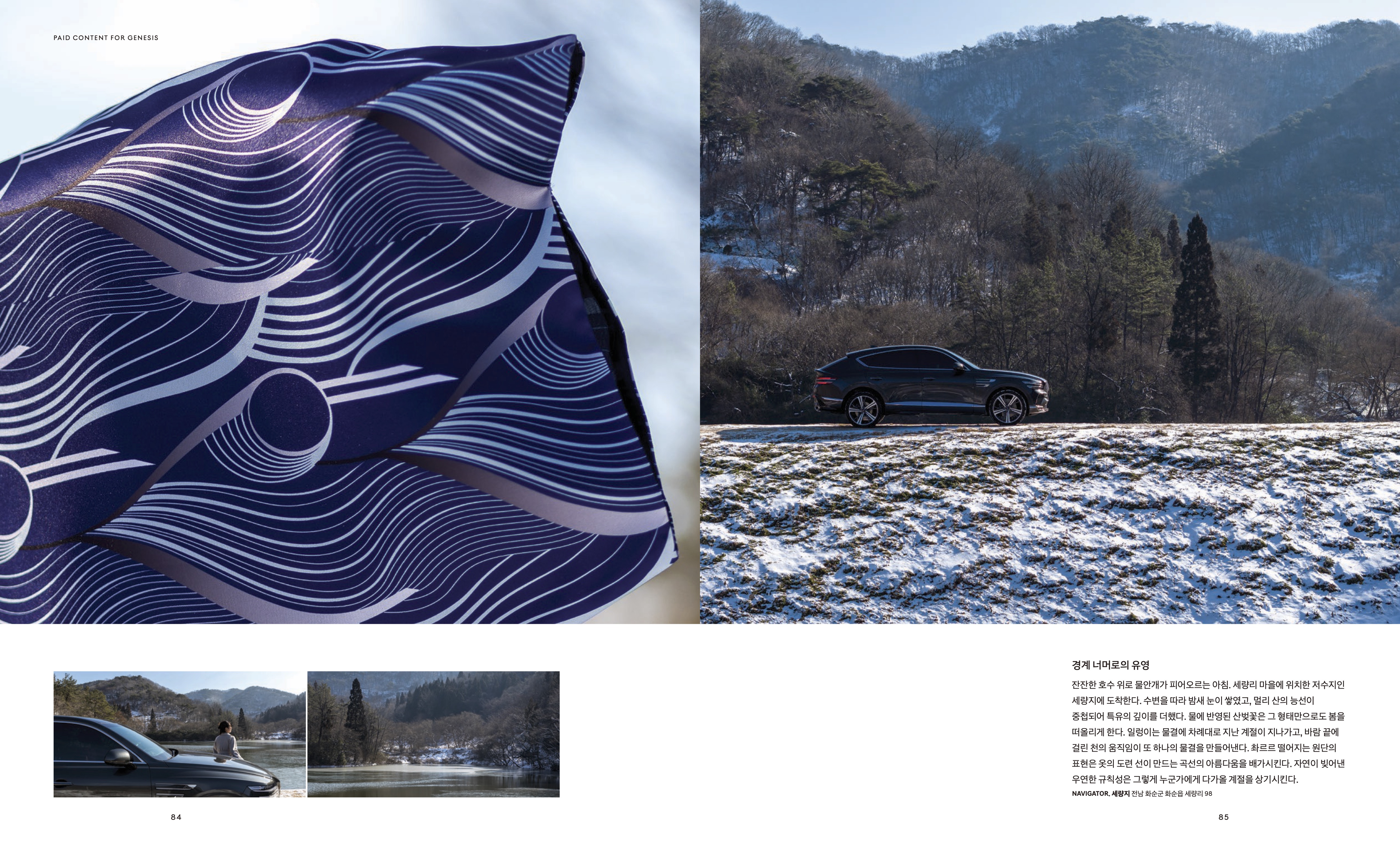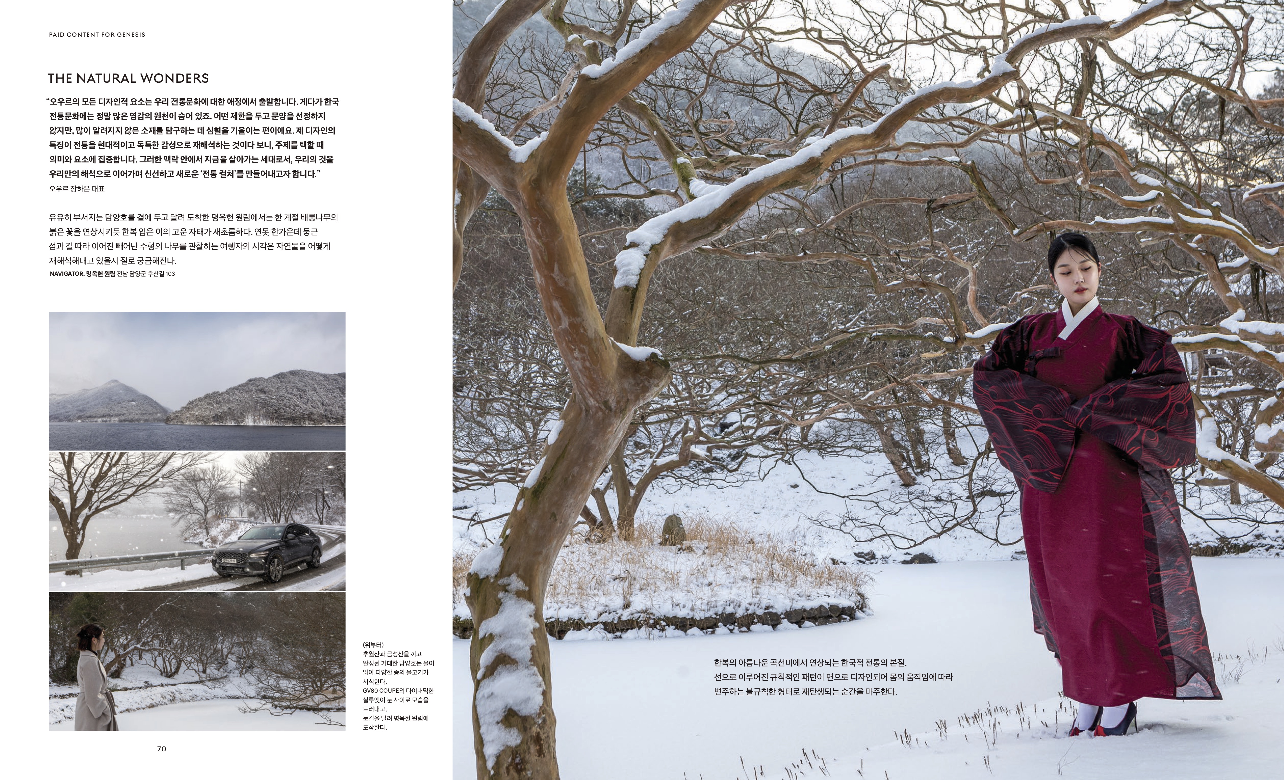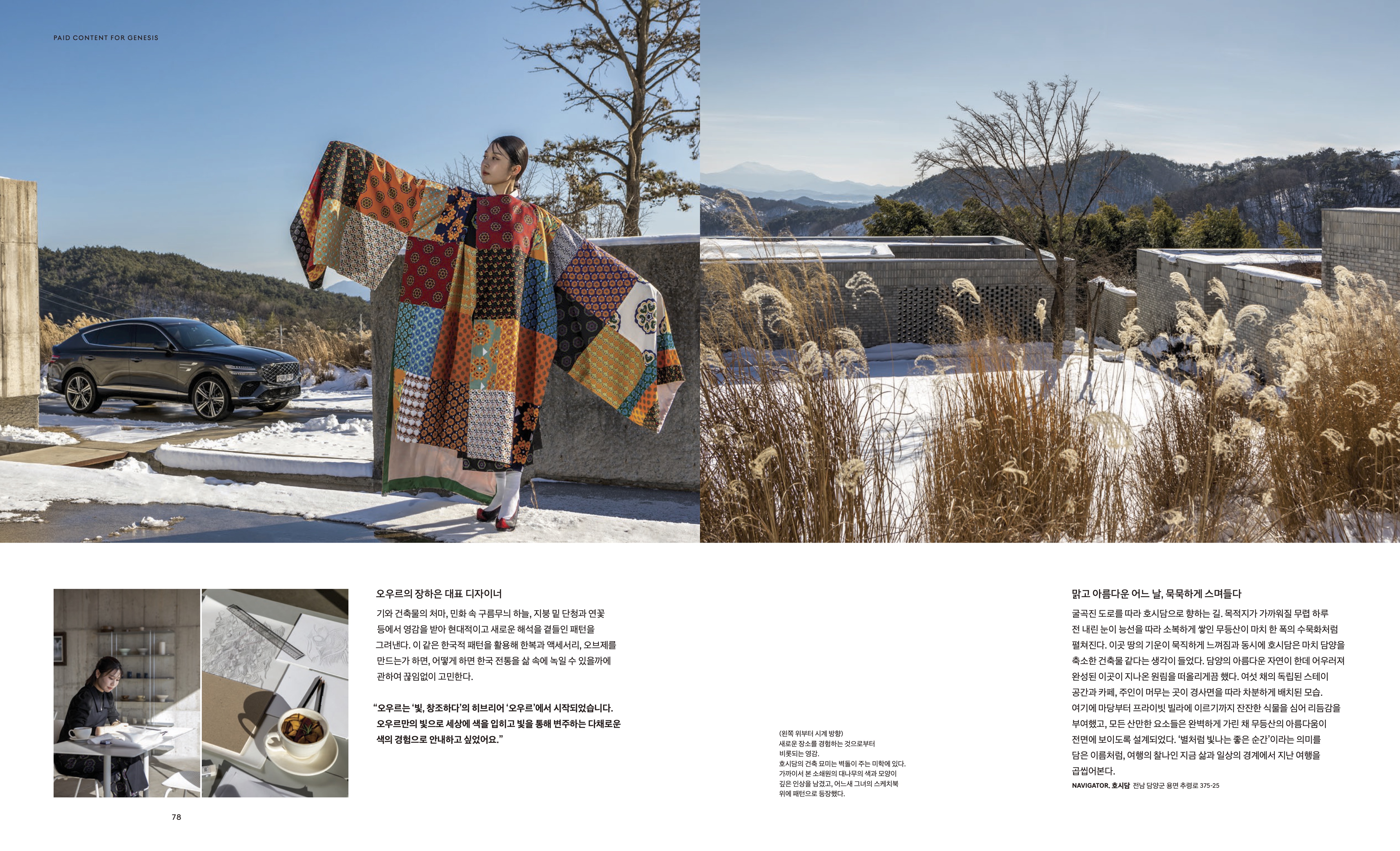 Designer Haeun Jang of OUWR, following her participation in the Genesis GV80 COUPE launch film, joined the Genesis Roadtrip feature in the March 2024 issue of National Geographic Traveler magazine. We are delighted to share the shining moments of nature through the timeless essence of tradition, alongside the Genesis GV80 Coupe.