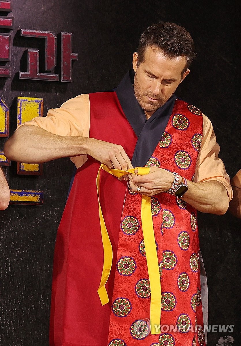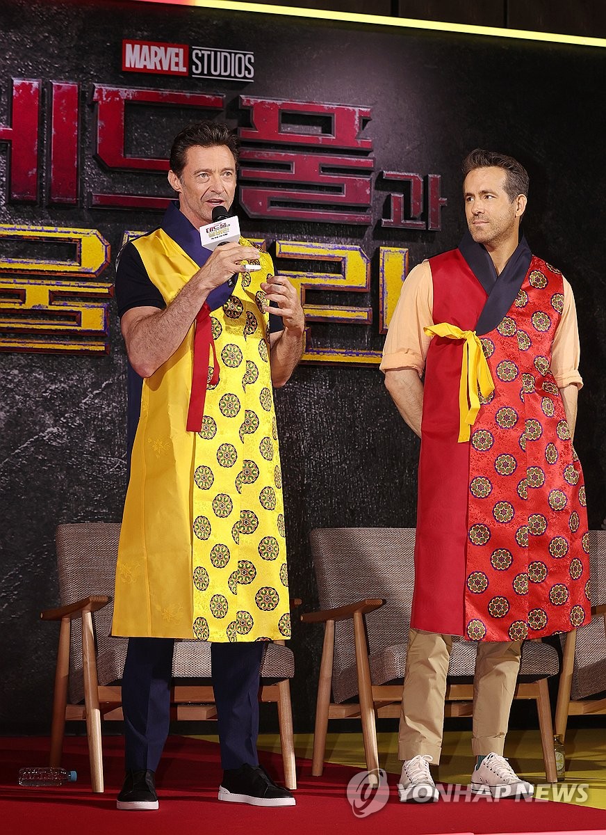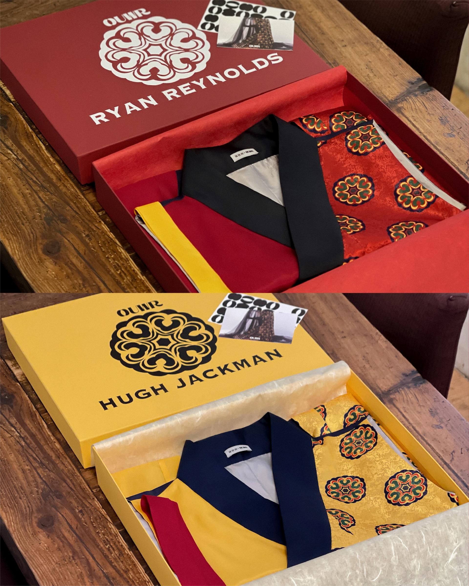 7On July 4th, during the press conference for the film Deadpool & Wolverine in South Korea, actors Ryan Reynolds, Hugh Jackman, and director Shawn Levy were presented with a special surprise of custom hanbok designed by OUWR in collaboration with Geumdanje.