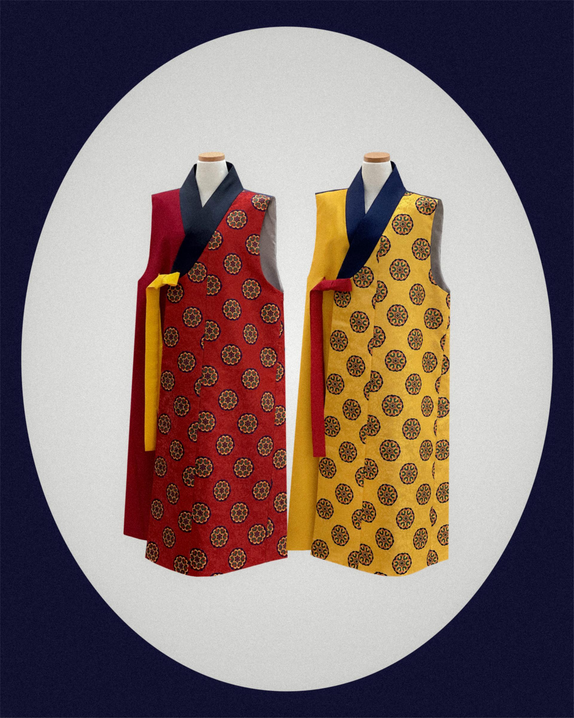 The dapho (搭胡), a traditional men's ceremonial garment, was historically worn as official attire or military uniform during the Joseon Dynasty. Initially featuring short sleeves, its design evolved into a sleeveless vest-like form. Drawing inspiration from the exceptional combat skills of the Marvel heroes Deadpool and Wolverine, the garments were designed to incorporate elements of the dapho. The key design motif integrates the signature colors of Deadpool and Wolverine, red and yellow, and with OUWR’s distinctive dancheong-inspired Guleum Ggot (Cloud Flower) pattern. The garments feature a structured collar and extended side slits for ease of movement and functionality, including convenient pocket access. Unlike a traditional hanbok set, these pieces were designed to be layered with contemporary clothing, offering versatility in styling.