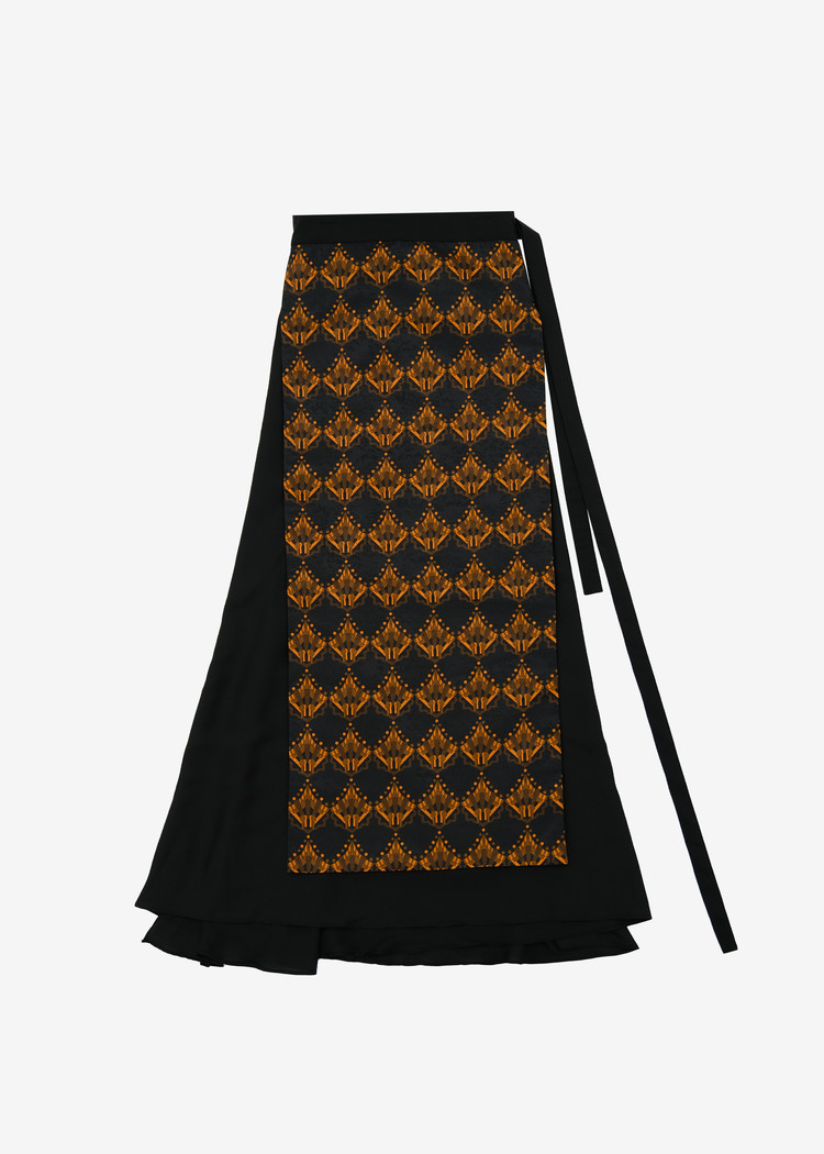 - This is a flared skirt designed by layering a subtly glossy satin fabric over a Suboro skirt featuring OUWR’s [P1 CHOEMA] pattern.