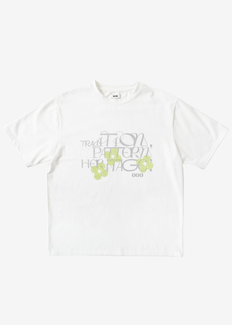 - 오우르의 아이덴티티가 담긴 레터링 그래픽과 시그니처 패턴 구름꽃을 레이어링한 아트웍 프린트 티셔츠입니다.